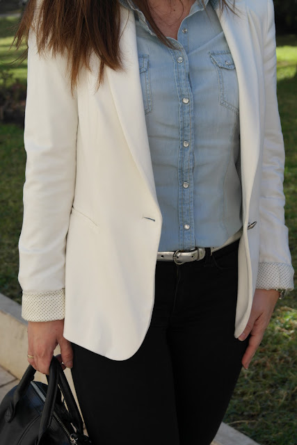 Hola chicas, hoy vengo con invitada especial, ya os la presenté el año pasado, es mi amiga Lola, y aquí podéis ver cómo combinar la misma camisa denim de dos maneras diferentes, ella eligió jeans en negro y blazer en blanco, y yo lo combiné con jersey de rayas y jeans en burdeos.